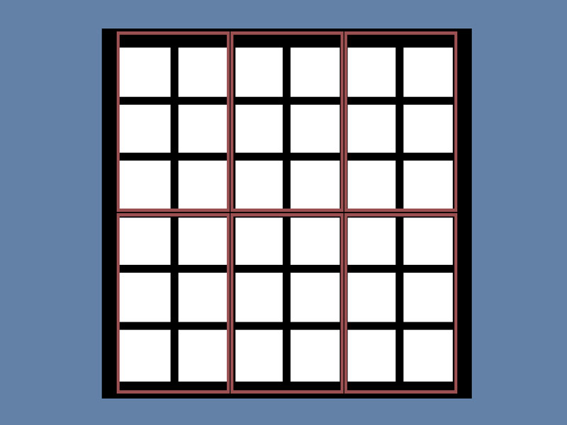 36 Quadrate auf sechs 16:10-Monitoren. Eine unbegrenzte Menge von Bild-Paaren könnte in beliebigem Rhythmus präsentiert werden.